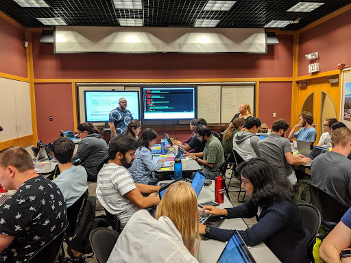 The primary instructor (standing in front) driving the lesson with the lesson webpage and terminal while a mentor (bottom, long blond hair) helps debug a specific issue with a participant (bottom right, long black hair)